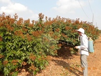 對(duì)于花帶葉和沖梢的類型,進(jìn)行脫小葉處理。在荔枝妃子笑品種上進(jìn)行化學(xué)藥劑脫小葉處理:國光乙烯利3-5ml/15kg,配合磷鉀營養(yǎng)。白糖罌等品種上不進(jìn)行化學(xué)藥劑脫小葉處理,一般進(jìn)行人工摘葉處理。