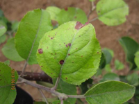主要為害葉片,也為害嫩枝和果實。發(fā)病初期,葉片上出現(xiàn)褐色或深褐色小點,后擴(kuò)大為直徑5-6毫米的病斑,周圍有紫紅色暈圈,邊緣清晰。天氣潮濕時,病斑上長出黑色霉層。幼葉被害,有時葉片呈畸形。為害嚴(yán)重時,被害葉干枯,提早脫落。果實被害,上生近似葉片上的斑點。枝條被害,也生褐色微凹陷的病斑,病斑周圍常產(chǎn)生裂紋。