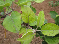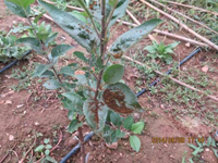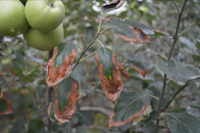 不同蘋果品種的感病性有明顯差異。高溫多雨,當(dāng)氣溫在10-20℃,光照較強,癥狀較重。樹勢衰弱時,癥狀較重,幼樹比成株易發(fā)病。土壤干旱,水肥不足時發(fā)病重。
