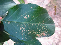 若蟲從蘋果樹開花后即在蘋果新梢上吸取汁液,產(chǎn)生黑褐色刺點或孔洞,嚴(yán)重的整葉出現(xiàn)很多孔洞,致蘋果葉畸形或破裂,新梢不能生長甚至死亡,影響光合作用和樹體生育。在幼果面上刺吸造成壞死點,隨幼果生長,壞死點處形成術(shù)栓化組織。