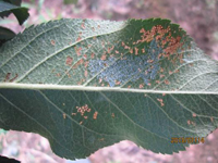 病菌在檜柏上為害小枝,即以茵絲體在菌癭中越冬。第二年春天形成褐色的冬孢子角。冬孢子柄被有膠質(zhì),遇降雨或空氣極潮濕的胺化膨大,冬孢子萌發(fā)產(chǎn)生大量擔(dān)孢子,隨風(fēng)傳播到蘋果樹上。銹菌侵染蘋果樹葉片、葉柄、果實及當(dāng)年新梢等,發(fā)病期持續(xù)一個月。