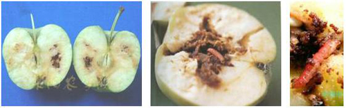 被害果果面有針頭大小的蛀(入)果孔,由孔流出淚珠狀汁液,干涸后呈白色蠟狀物。幼蟲取食果肉形成彎曲縱橫的蟲道,蟲糞留在果內(nèi)呈“豆沙餡”狀。幼果被害后,生長發(fā)育不良,形成凹凸不平的“猴頭果”;后期受害的果實,果形變化不大;被害果大多有圓形幼蟲脫果孔,孔口常有少量蟲糞,由絲粘連。