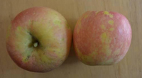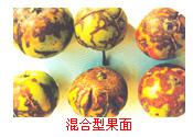 2.花臉型,著色后果面散生近圓形黃綠色斑塊,成熟后為紅綠相間的花臉狀。黃色品種如黃龍、黃沙果、黃太平蘋果等病果成熟后果面色澤不勻,出現(xiàn)濃淡相間的斑塊,果面略呈凹凸不平狀。