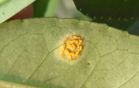 主要為害成熟或近成熟葉片。葉片染病葉背面現黃色、裸露的夏孢子堆,大小0.2—0.4mm,圓形至橢圓形,包被破裂后變為橙黃色,后又褪為淺黃色,在與夏孢子堆對應的葉正面現紅褐色斑塊,秋后又形成冬孢子堆,圓形,大小0.2—0.7mm,橙黃色至暗黃色,嚴重時孢子堆擴展至全葉。