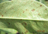 癥狀:常在花期染病,先侵染葉片,初沿主脈產生圓形至不規則形的黑褐色小斑,病斑周圍有褪綠暈圈,后在葉片正面現邊緣呈網紋狀的不規則形褐色斑,且病部可見粟褐色小點,即病菌分生孢子器不透過葉面。陰雨連綿時葉面病斑較大,近圓形,黑褐色;葉背病斑不明顯,淡褐色,重者病斑融合。病部可見粟褐色小點,即病菌分生孢子器。干燥條件下病斑易破裂穿孔。生產上該病常與褐斑病、黑斑病混合發生,造成嚴重落葉。