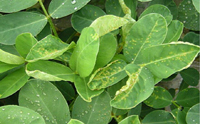 癥狀:花生出苗后即見發病。初在頂端嫩葉上現褪綠黃斑,葉片卷曲,后發展為黃綠相間的黃花葉、網狀明脈和綠色條紋等癥狀。病害發生后期癥狀有減輕趨勢。