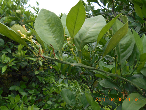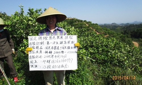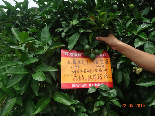 20154月,江西省贛州市石城縣沙段村,在臍橙謝花2/3和第二次生理落果期使用兩次“國光植生源2000-2500+赤霉酸2000-2500+氨基酸水溶肥1000倍”葉面噴施,使用后的臍橙葉片深綠,光澤度好,坐果率高,果型均勻,保果效果明顯。