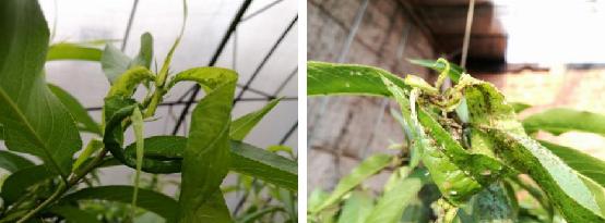 蚜蟲主要為害桃樹幼嫩枝葉,春季當桃樹發芽展葉時,蚜蟲聚集桃樹嫩枝和新葉上,用細長的口針刺入植物組織內部吮吸汁液,桃葉受害后呈現黑點、紅色或黃色斑點,葉卷曲皺縮,導致葉片干枯或提前脫落,嚴重影響桃樹枝葉正常生長。同時蚜蟲排泄的蜜露、污染葉面及枝梢,使桃樹生理活動受阻,常造成煙煤病,同時加速桃葉早期落葉。