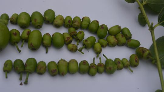 發(fā)病后期,棗吊發(fā)病部位失水,有的棗吊則出現(xiàn)斷裂,花蕾脫落。發(fā)生嚴(yán)重時(shí)花蕾較少甚至形不成花蕾,座果率顯著降低,甚至座不住果子。后期則棗吊干枯,棗吊上坐住的果實(shí),由于營(yíng)養(yǎng)不良,品質(zhì)受到很大影響.