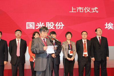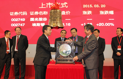 2015年3月20日上午,四川國光農化股份有限公司上市儀式在深圳證券交易所隆重舉行。公司董事長顏昌緒,資陽市委書記、市人大常委會主任周喜安、農業部藥檢所總農藝師季穎、中國農藥工業協會會長孫叔寶、中共資陽市委常委郎寬、資陽市人民政府副市長毛紹百、簡陽市人民政府市長趙春淦等政府主要領導及公司董事、監事、高管出席了上市儀式。