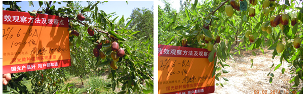 2014年7月,新疆吐魯番伊拉湖鮑秀,在灰棗幼果期噴施國光植生源1000倍+國光優(yōu)豐1500倍,使用1次,成熟期觀察,使用保果膨果套餐灰棗,保果效果好,棗果膨大明顯,且不影響上色成熟,畸形果率少;對產(chǎn)量進行測定,使用保果套餐灰棗增產(chǎn)12%。