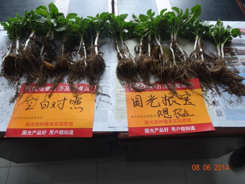 當時將馬鈴薯根系取下并測量根系的數量,可以明顯發現使用國光根寶的根系數量大且比對照長,根系比較發達。而對照的根系比較短、少。