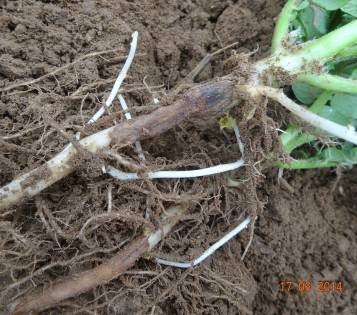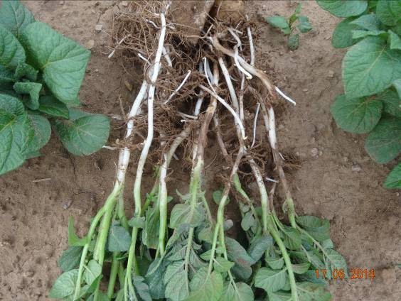 試驗(yàn)背景:隨著馬鈴薯面積的擴(kuò)大,連作障礙土傳性病害越來(lái)越嚴(yán)重,特別是像黑痣病、枯萎病近2年發(fā)生特別嚴(yán)重,而且治療非常困難。市面上防治這類(lèi)病害的藥劑效果好的很少。2014年由于前期地溫比較低、濕度大,黑痣病感染比較嚴(yán)重,有的甚至已經(jīng)感染匍匐莖,嚴(yán)重影響到馬鈴薯的生長(zhǎng)。