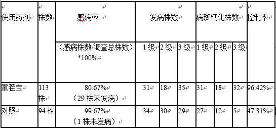 2、 用藥處理后,大多數(shù)植株病斑已鈣化,病情發(fā)展得到控制,其中重茬寶200ml/畝控制率達(dá)到96.42%,其中對(duì)發(fā)病較輕的植株(1級(jí)、2級(jí))控制率達(dá)到100%。
