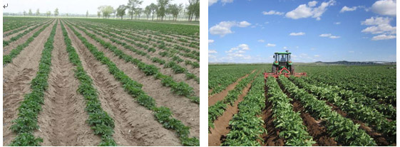 馬鈴薯培土可使植株埋入土下的節(jié)數(shù)增多,增加匍匐莖的數(shù)量,形成更多和更大的塊莖,防止干旱裂畦,塊莖見(jiàn)光導(dǎo)致薯皮發(fā)青。在苗期當(dāng)株高10~15厘米左右時(shí),結(jié)合中耕除草進(jìn)行第一次適當(dāng)培土,做到鋤通壟背、靠緊壟眼,除盡雜草,不傷根苗;在苗高25厘米左右時(shí)進(jìn)行第二次中耕培土,培土5~7厘米;在開(kāi)花前進(jìn)行第三次中耕鋤草,高培土,以利于結(jié)薯。