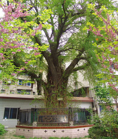 簡介:銀杏,俗名白果,是我國珍貴樹種;這株銀杏樹栽于簡陽市老政府后院,樹高20余米,胸徑1.7米,胸圍5.3米,據(jù)簡陽記載,栽植于明朝萬歷二十三年(公元1595年),距今400余年,任然生長旺盛,每當(dāng)陽春三月,枝葉萌發(fā),綠影婆娑;秋涼時節(jié),夕照輝映,金光閃耀。樹干氣根下垂,年復(fù)一年日益壯大;其為簡陽之一景。