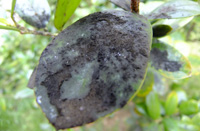 煤污病主要危害植物的葉片,也危害嫩枝、花器等部位。發病初期在葉面、枝梢表面上形成圓形黑色小霉斑,有的沿主脈擴展,后擴大連片,使整個葉面、嫩梢上布滿黑霉層,形成較厚的黑色或黑褐色的煤煙狀層,嚴重時形成黑色霉層,有時在干燥條件下霉層開裂剝落。